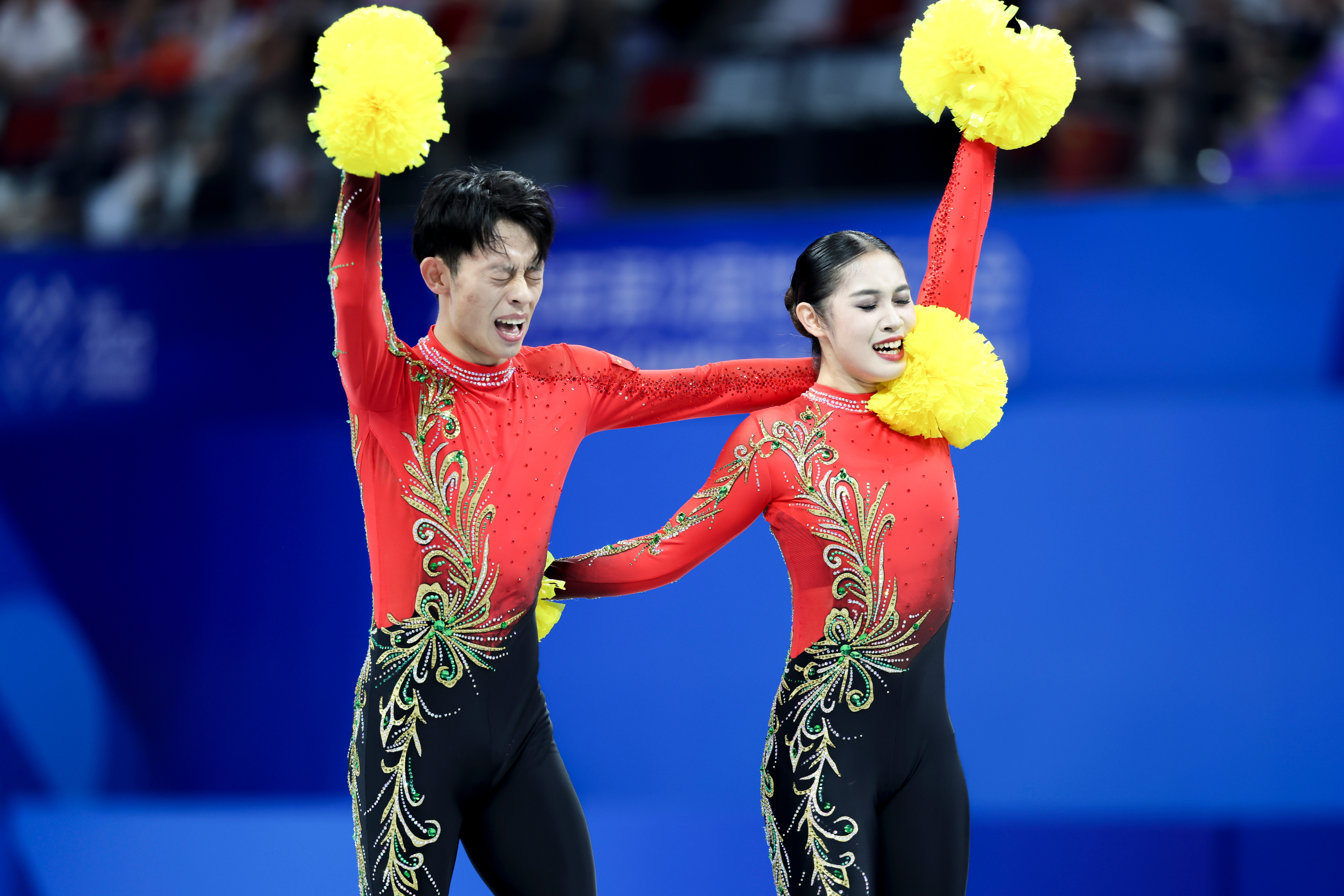 8月16日,中国组合李嘉欣/王亚洲在2025年景王红尘运会啦啦操双东谈主花球比赛中。新华社记者 王翔 摄