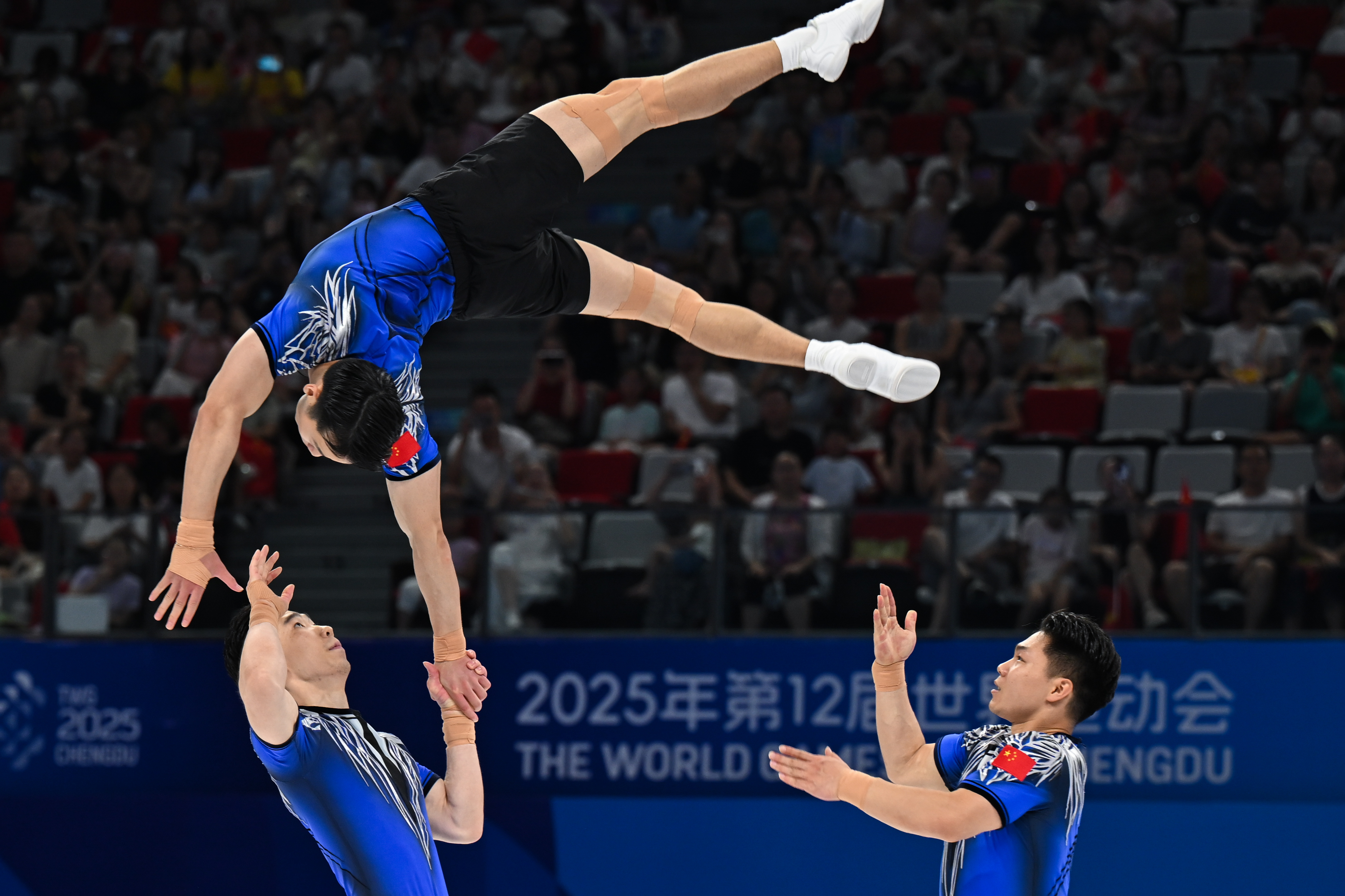 8月16日,中国队在比赛中。当日,2025年景王红尘运会健好意思操三东谈主操决赛举行,中国队取得冠军。新华社记者 杜子璇 摄